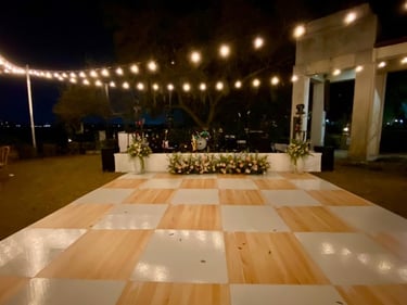 THE PERFECT ADDITION TO ELEVATE YOUR EVENT. THIS DANCE FLOOR RENTAL IS A CLASSICAL DESIGN TO SET THE STAGE FOR UNFORGETTABLE MOMENTS AT YOUR INDOOR OR PATIO EVENT. DANCE FLOOR MUST BE ON A LEVEL HARD SURFACE AND COVERED FROM THE SUN OR RAIN.